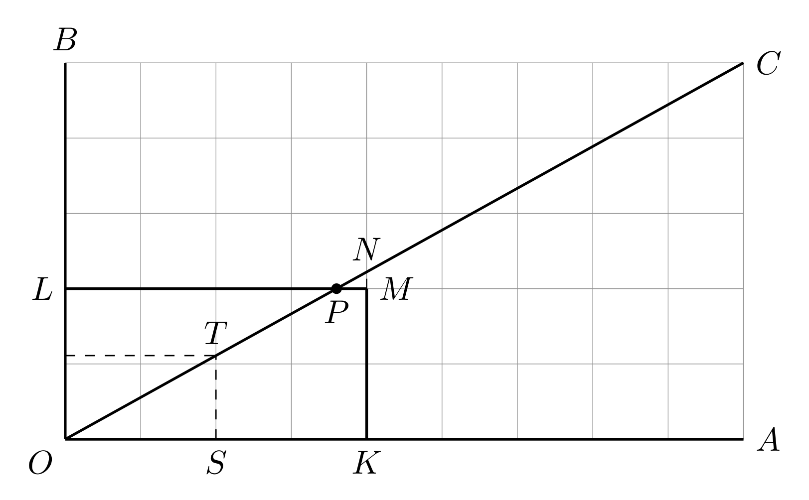 The proof may be stated in a geometrical form. In the figure \(AC\) and \(BC\) are \(x = p\), \(y=q\), and \(KM\) and \(LM\) are \(x = p^{\prime}\), \(y = q^{\prime}\). If (as in the figure) \(p > q\), then \(q^{\prime}/p^{\prime} < q/p\), and \(M\) falls below the diagonal \(OC\). Since \[q^{\prime} < \frac{qp^{\prime}}{p} < q^{\prime}-l,\] there is no integer between \(KM = q^{\prime}\) and \(KN = qp^{\prime}/p\).
